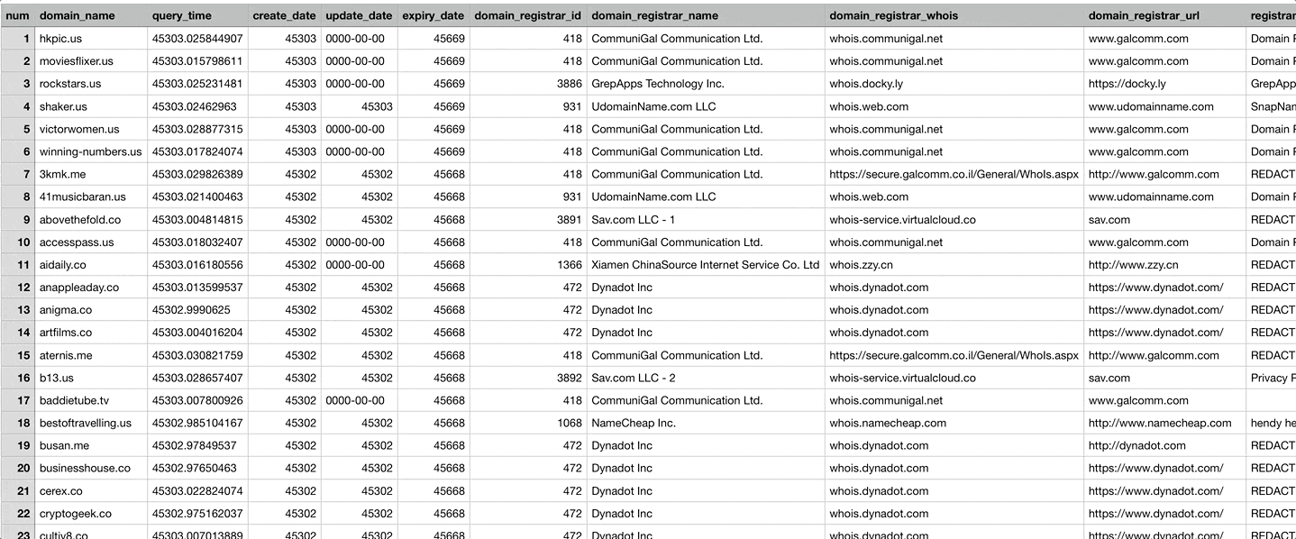 Daily dump of all domains created on the Internet, that's mean all new companies. You will get around +100K leads of new domains created each day with location, phone numbers, emails, domains, registered date, and more. It's perfect for capturing new companies created on the Internet and generate new leads from it by selling SEO, marketing services, WordPress websites, development or content creation, etc.